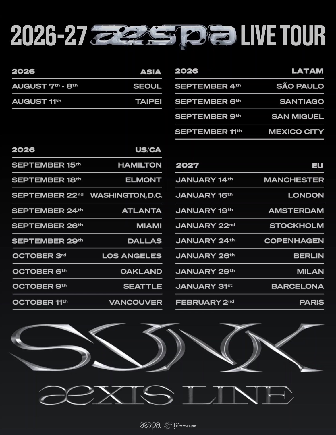 Alors que la quatuor s’apprête à revenir avec son second album studio LEMONADE, aespa a surpris ses fans en annonçant la tenue d’une nouvelle tournée mondiale colossale baptisée SYNK: aexis LINE. Cette dernière se conclura à Paris le 2 février 2027. Plus d’informations à venir prochainement…